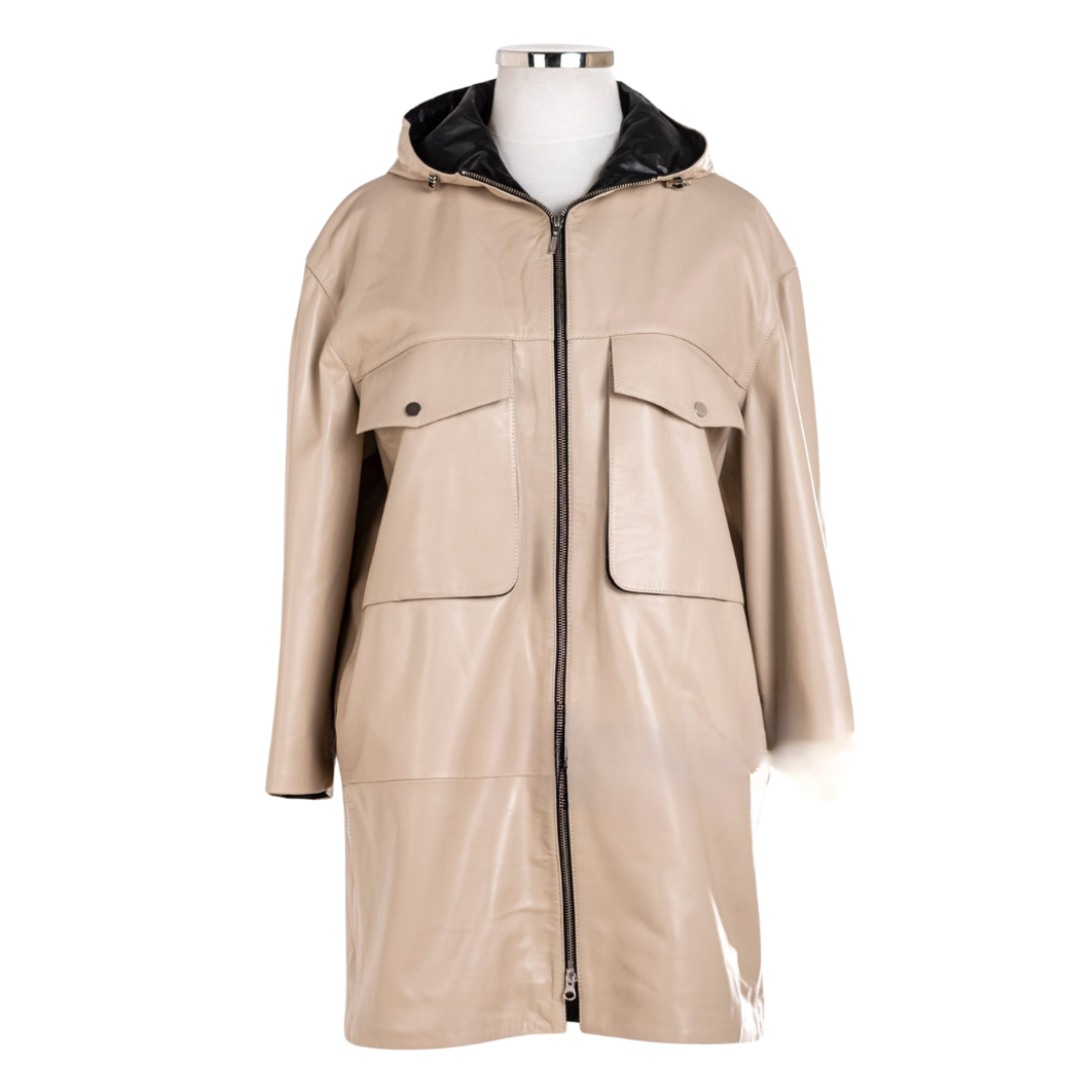 Embrace effortless style and modern practicality with our Women’s “Coastal Breeze” Relaxed Leather Hooded Coat. This contemporary coat is crafted from supple beige or light tan leather, offering a relaxed silhouette and a clean, minimalist design with thoughtful details. Featuring a comfortable fixed hood and convenient front pockets, it’s designed for the woman who appreciates understated luxury and versatile wear, perfect for the Karachi climate’s transitional seasons. Ideal for navigating city life or adding a sophisticated touch to your everyday adventures.
