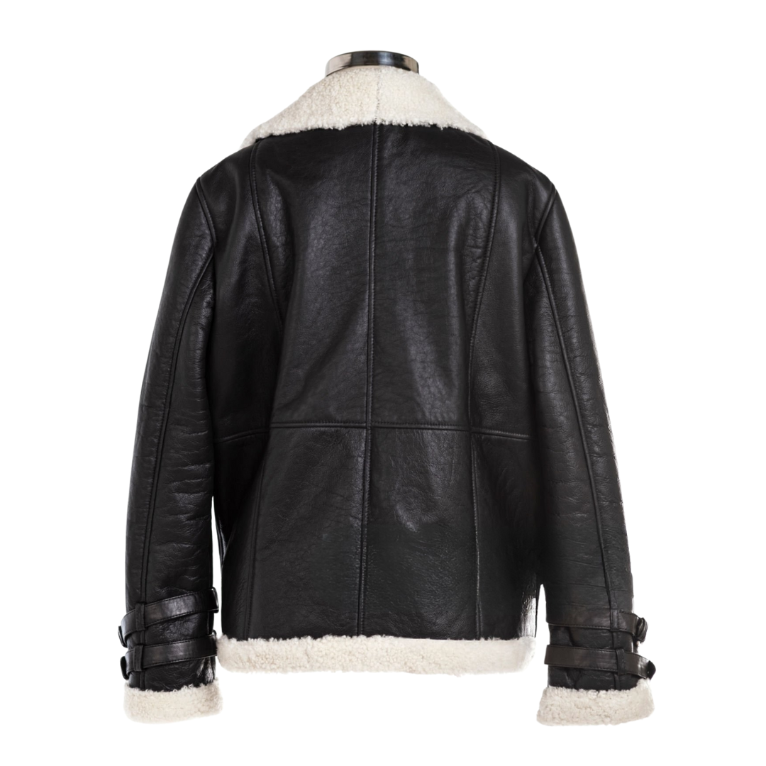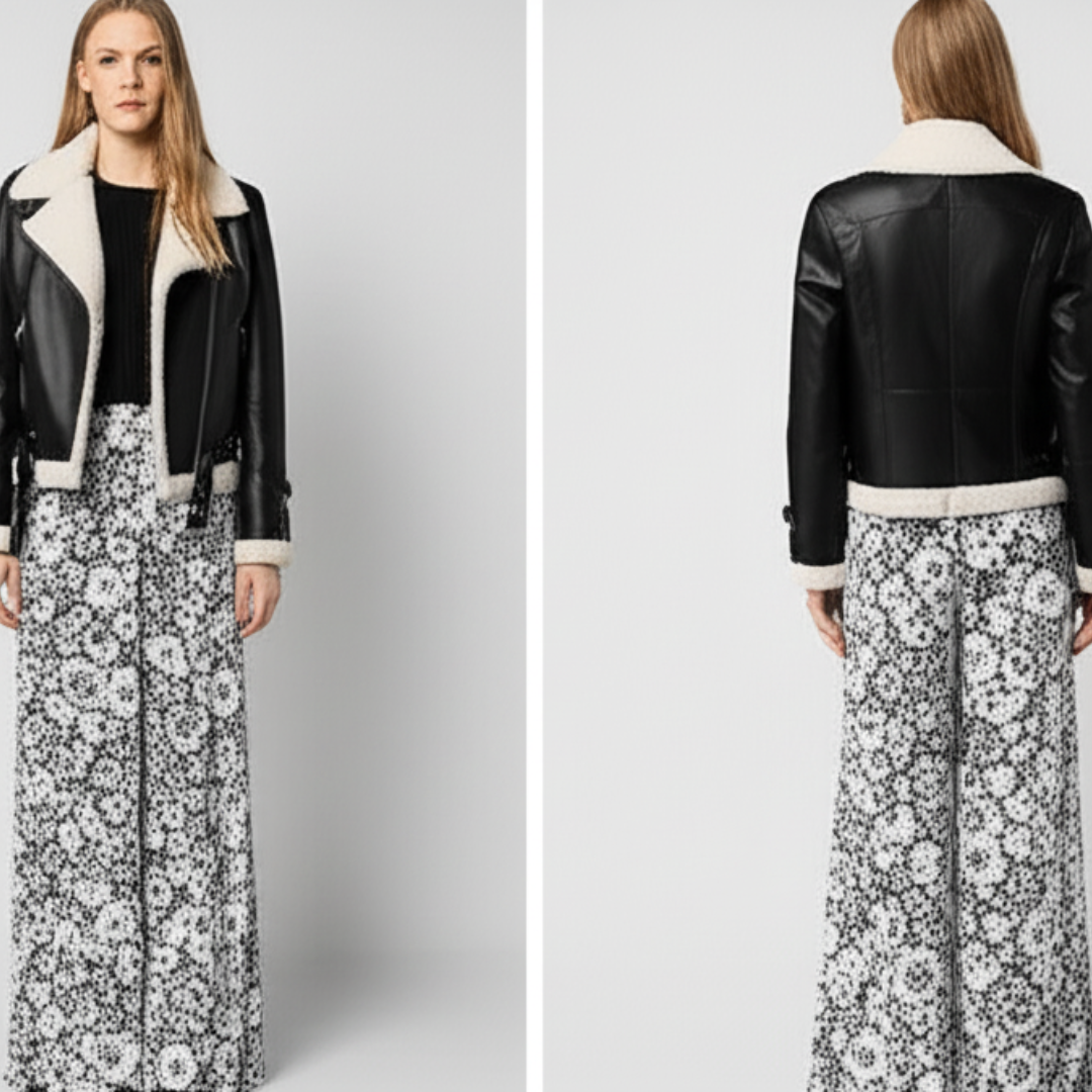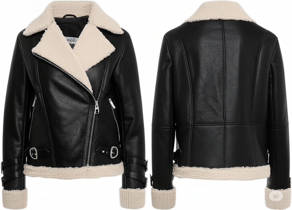 • Bold Visual Impact: The striking contrast between the black faux leather and white faux shearling ensures you’ll stand out from the crowd.