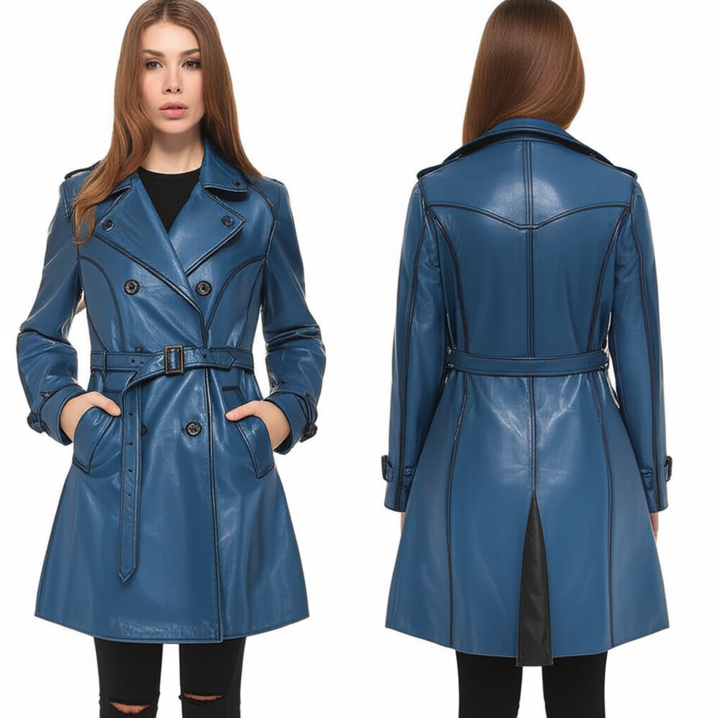 Make a captivating statement with our Women’s “Sapphire Siren” Double-Breasted Leather Trench Coat. This striking navy blue leather trench coat offers a modern twist on a timeless classic. Combining the sophistication of a trench with the edgy allure of leather, it’s designed for the woman who embraces bold fashion and effortless elegance. Perfect for elevating your urban style or making an unforgettable impression.